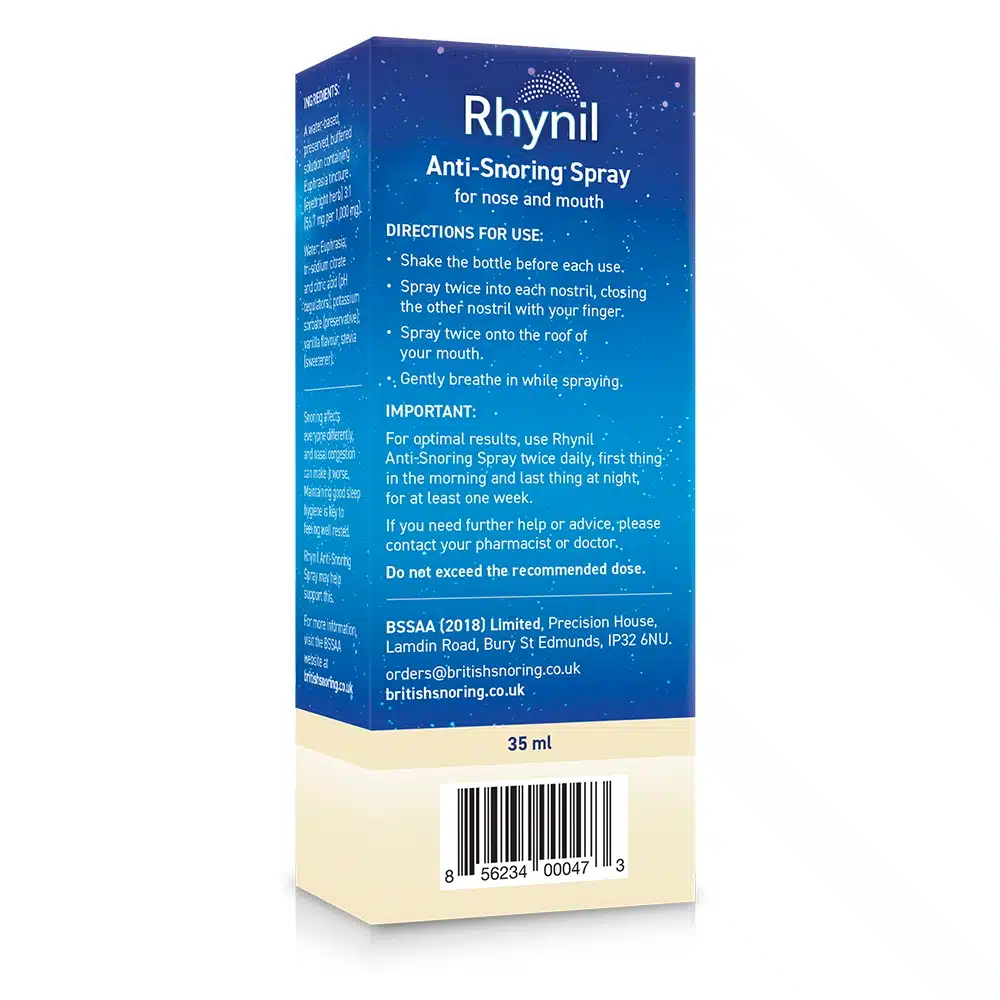 This is the second time I have tried Rhynil. The first time I gave up (a couple of years ago) I found it to be a little astringent and not nice to use. However, have tried again due to the pain I am causing my wife with snoring.From day 1 it seems to be reducing my snoring. I am still snoring when on my back, but when on my side and not having had an alcoholic drink, but snoring is certainly reduced according to my wife. I don’t know whether this has been reformulated recently, but I am finding it less astringent than before and does not cause any discomfort when spraying.